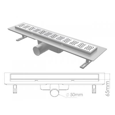 Сливной трап горизонтальный D 50, решетка нерж.с площадкой под плитку, 65х600мм, волна, NOVA