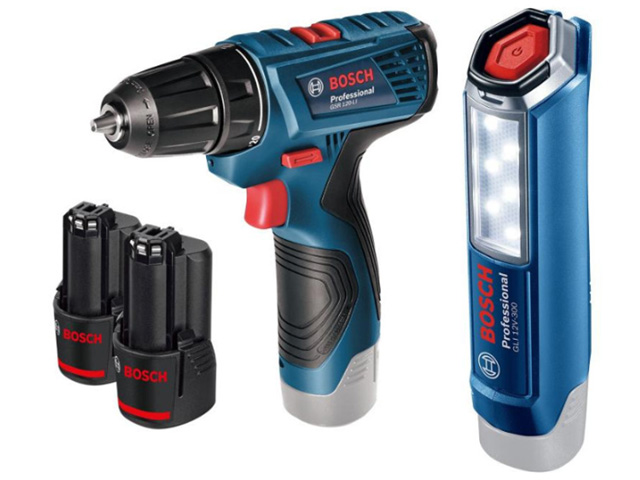 Аккум. дрель-шуруповерт BOSCH GSR 120-LI в чем. + фонарь GLI 12V-300 (12.0 В, 2 акк., 1.5 А/ч Li-Ion, 2 скор., 30 Нм, шурупы до 7 мм)