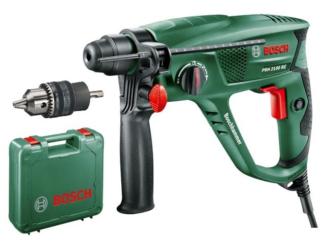 Перфоратор BOSCH PBH 2100 SRE в чем. (550 Вт, 1.7 Дж, 3 реж., патрон SDS-plus, ЗВП в комплекте, вес 2.2 кг)