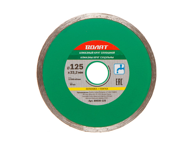 Алмазный круг 125х22 мм по керамике сплошн. ВОЛАТ (мокрая резка)