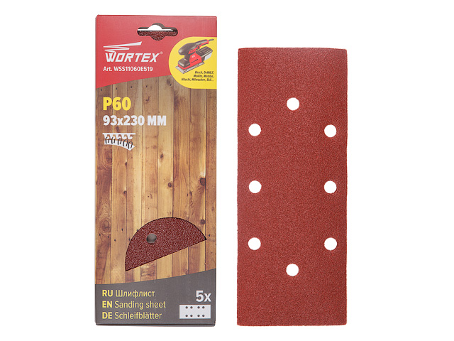 Шлифлист 93х230мм Р60 д/дерева самосцепл. 8 отв. 5шт WORTEX