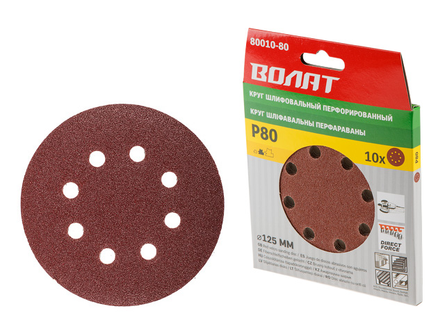 Шлифлист 125мм круг Р 40 д/дерева 8 отв. 10шт. ВОЛАТ (круг абразивный шлифовальный перфорированный)