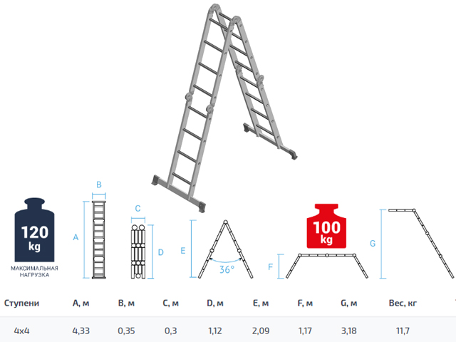 Лестница алюм. многофункц. трансформер 4х4 ступ., 11,7кг PRO STARTUL (ST9943-04)