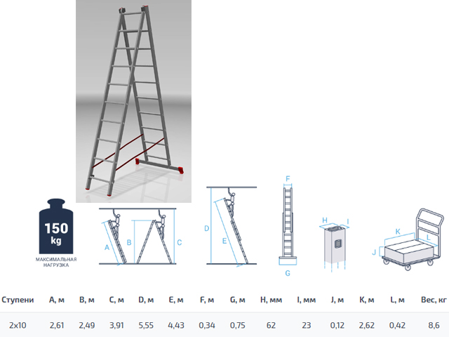 Лестница алюм. 2-х секц. 249/443см 2х10 ступ., 8,6кг PRO STARTUL (ST9946-10)