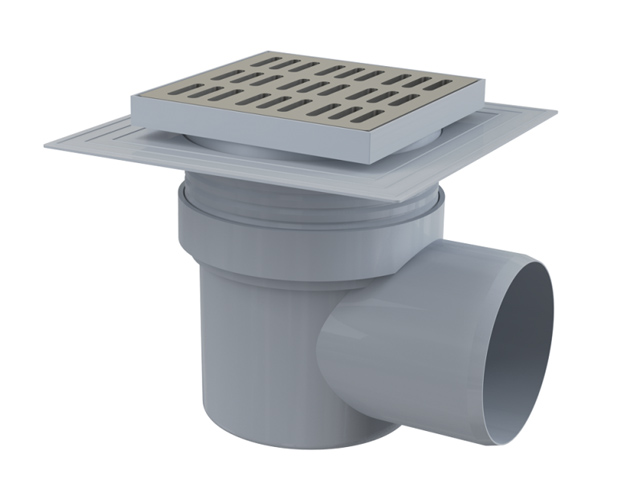 Сливной трап 150х150/110, подводка - боковая, решетка - нержавеющая сталь, воротник- 2-х уровневая (Alcaplast)