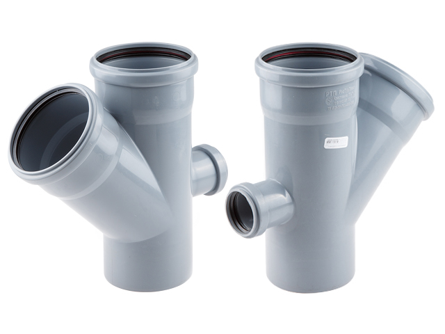 Крестовина двухплоскостная канализационная Ростурпласт диаметром 110 мм под углом 45 градусов для монтажа систем внутренней канализации. Имеет выход с левой стороны под трубу 50 мм
