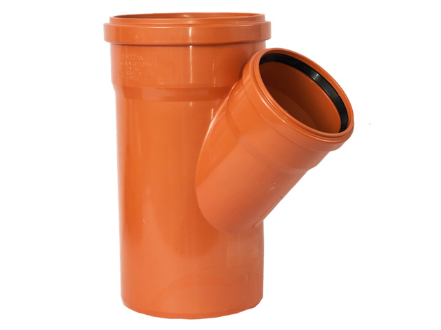 Тройник канализационный для трубы диаметром 160 мм. Имеет выход под трубу диаметром 110 мм под углом 45 градусов. Применяется при монтаже систем наружной канализации.