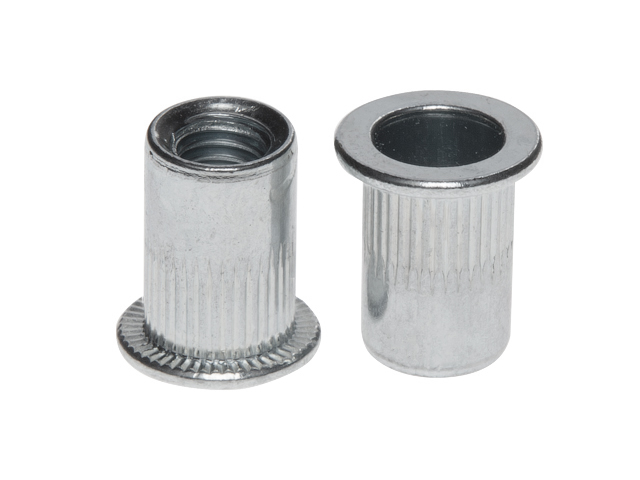 Стальная оцинкованная резьбовая заклепка с насечками и цилиндрическим бортиком применяется для соединения материалов, где необходимо создать