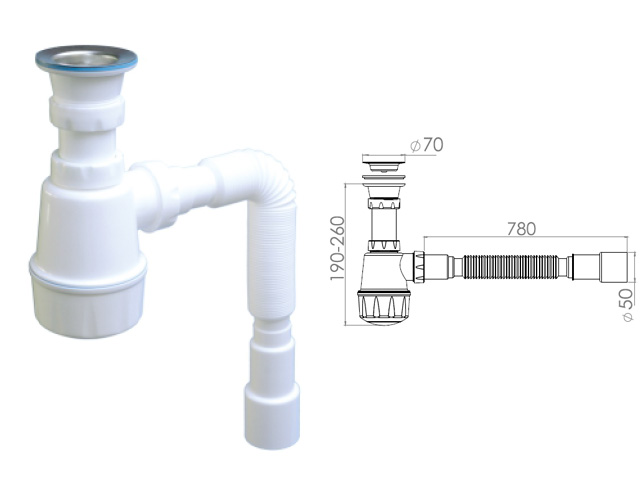 Сифон для кухни с прикручивающимся выпуском 70мм, с гибкой трубой 1 1/2" - 40/50мм, NOVA