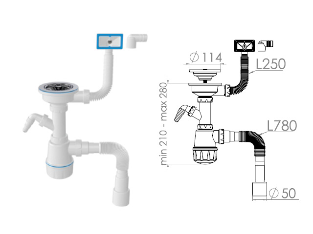 Сифон для кухни с прямоугольным переливом , выпуск 3 1/2, с гибкой трубой 1 1/2" - 40/50мм, NOVA купить в Минске: