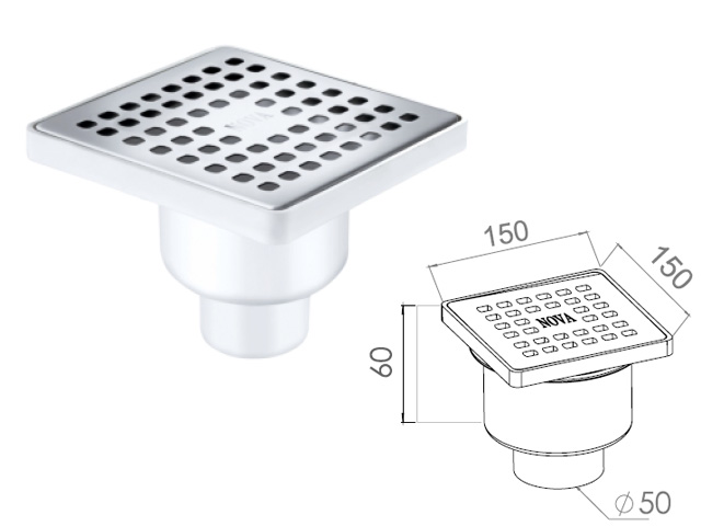 Сливной трап вертикальный D 50, с сухим затвором, решетка нерж. 150х150 мм, NOVA