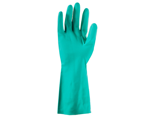 "Защитные перчатки из нитрила. Внутри флокированы 100% хлопком. Текстурная поверхность ладони в виде ромбов для лучшего захвата. Слегка расширенная манжета для вентиляции. Отличная эластичность и комфорт. Хорошая устойчивость к растворителям и химикатам. Высокая износоустойчивость.Каждая пара в упаковке. Цвет - зеленый. Размеры: M, L, XL, XXL"