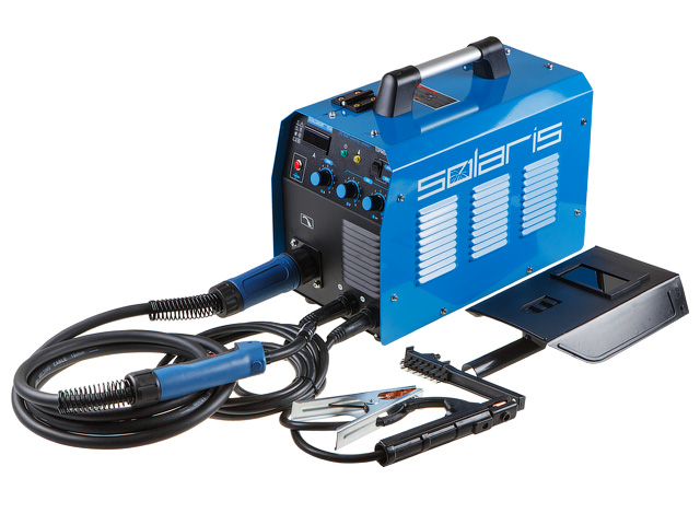 Инверторный полуавтомат, оснащенный евроразъемом для подключения любой совместимой горелки. Данный аппарат способен варить как проволокой в режиме полуавтоматической сварки, так и электродами в режиме ручной сварки. Поставляется со сварочной горелкой Solaris WG-15AK высокого качества.