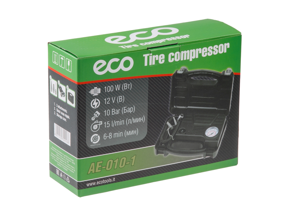 Компрессор автомобильный ECO AE-010-1 (15 л/мин, 10bar, 100Вт, 12В) (12В, 100Вт, 10bar, 15 л/мин, пластиковый кейс)