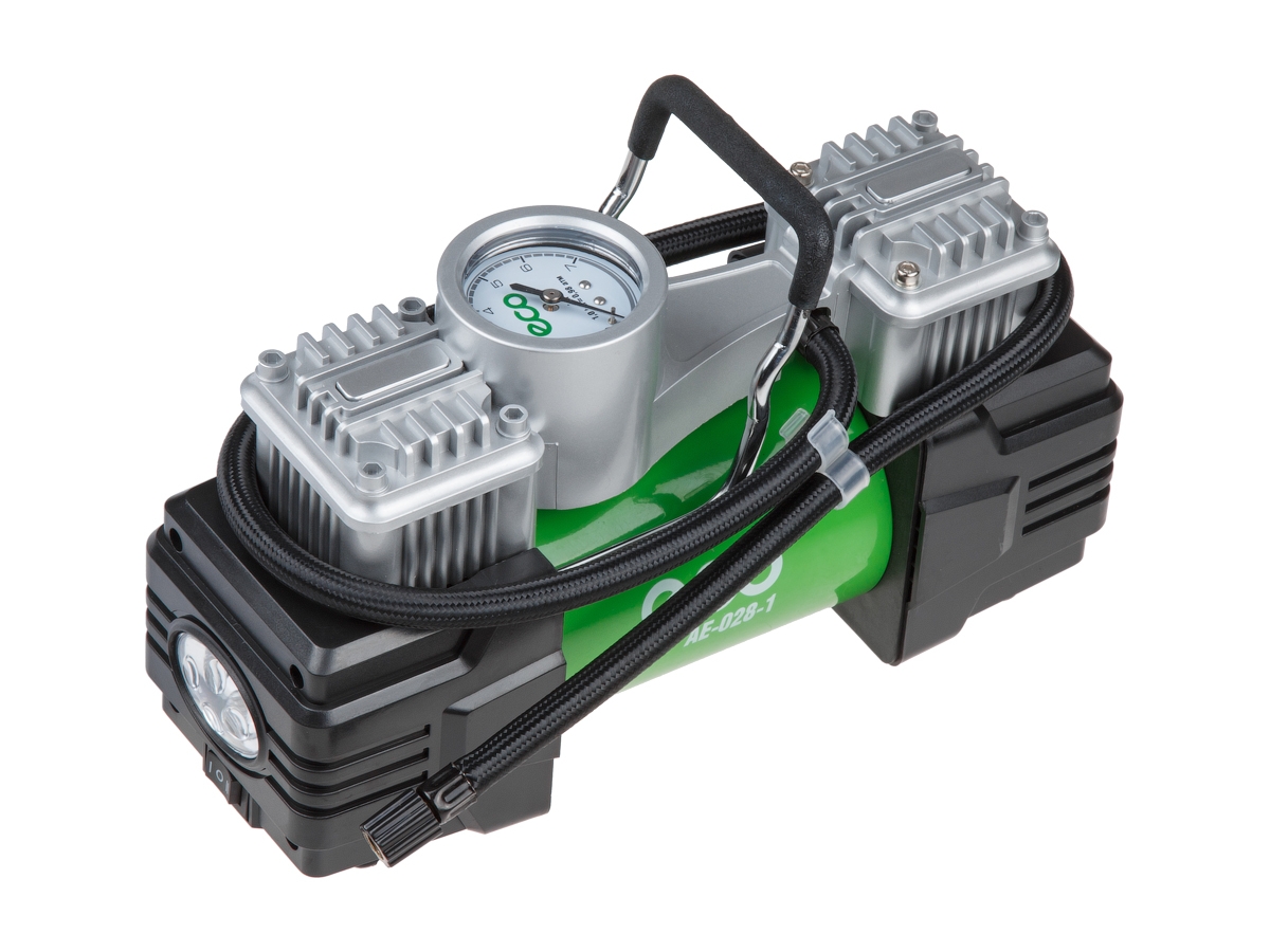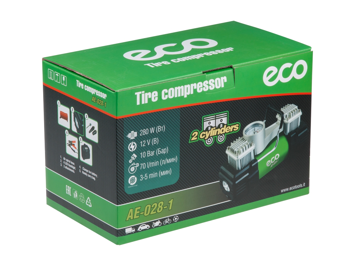 Компрессор автомобильный ECO AE-028-1 (70л/мин, 10bar, 280Вт, 12В) (12В, 280Вт, 10bar, 70л/мин, 2 цилиндра, фонарь, сумка)