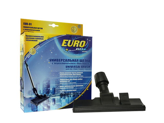 EUROCLEAN EUR-01 Щетка с переключателем <Пол/Ковер> предназначена для чистки гладких поверхностей и ковровых покрытий. Оснащена удобным ножным переключателем. Универсальна для всех типов пылесосов. Снабжена универсальным зажимом, позволяющим крепить ее на большинство моделей пылесосов c диаметром трубки от 27 до 37 мм.
