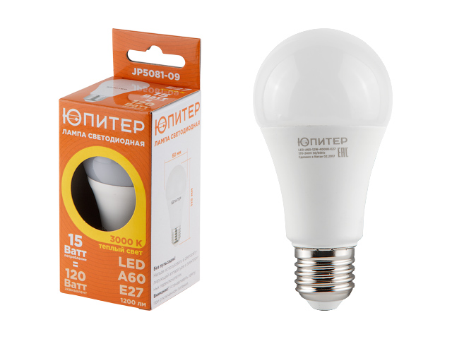 Лампа светодиодная A60 СТАНДАРТ 15 Вт 170-240В E27 3000К ЮПИТЕР (100 Вт аналог лампы накал., 1200Лм, теплый белый свет)