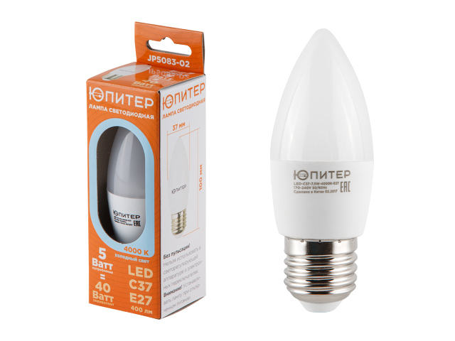 Лампа светодиодная C37 СВЕЧА 5 Вт 170-240В E27 4000К ЮПИТЕР (40 Вт аналог лампы накал., 400Лм, нейтральный белый свет)