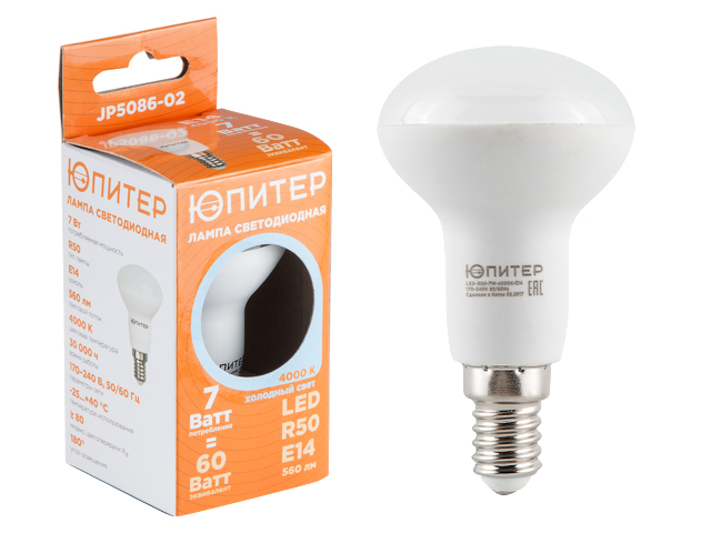 Лампа светодиодная R50 7 Вт 170-240В E14 4000К ЮПИТЕР (60 Вт аналог лампы накал., 560Лм, нейтральный белый свет)