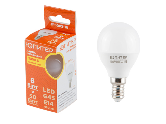 Лампа светодиодная G45 ШАР 6 Вт 170-240В E14 3000К ЮПИТЕР (45 Вт аналог лампы накал., 450Лм, теплый белый свет)