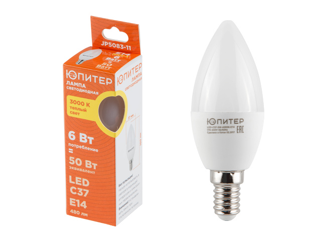Лампа светодиодная C37 СВЕЧА 6 Вт 170-240В E14 3000К ЮПИТЕР (45 Вт аналог лампы накал., 450Лм, теплый белый свет)