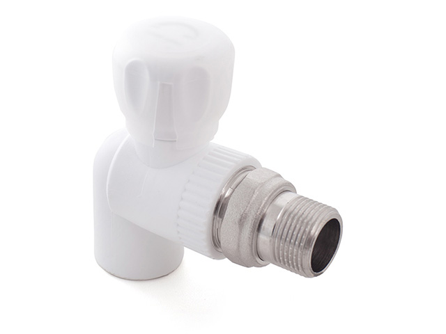 Шаровой кран с полипропиленовым корпусом, угловой. Применяется для подключения радиаторов к разводке из полипропиленовых труб. Позволяет перекрывать поток теплоносителя через отопительный прибор. Подключение крана к радиатору производится с помощью латунного никелированного полусгона, закрепленного на закладной детали накидной гайкой. Соединение с трубой - раструбной сваркой.