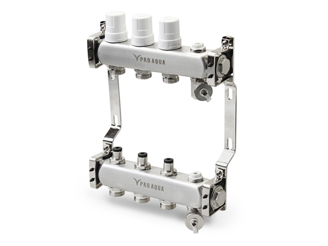 Гребенка для отопления Pro Aqua - это эффективное решение для организации системы отопления. Блоки произведены из нержавеющей стали марки AISI 304, которая является одним из самых экологичных материалов. Толщина стенки коллекторного блока Pro Aqua увеличена и составляет 1,6 мм, стандарт 1,5 мм. Коллекторные блоки имеют увеличенное проходное сечение 40x40.7 мм (16.28 см2) и обладают повышенной пропускной способностью.