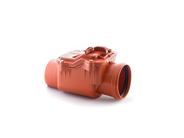 Клапан обратный канализационный с запирающей заслонкой из профилированной нержавеющей стали с язычковым уплотнением, с ревизионной крышкой и присоединительными выходами под раструбные трубы ПП, ПВХ, с возможностью фиксации заслонки в закрытом состоянии при помощи ручного фиксатора с предохранителем от самопроизвольного закрытия.