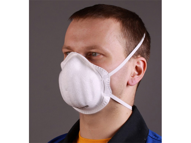 Формованный респиратор из нетканого фильтрующего материала, имеющий эластичные ленты оголовья.