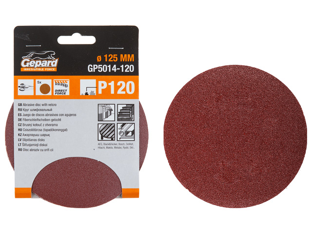 Шлифлист 125мм круг Р180 д/дерева 5шт. GEPARD (GP5014-180) (круг абразивный шлифовальный)