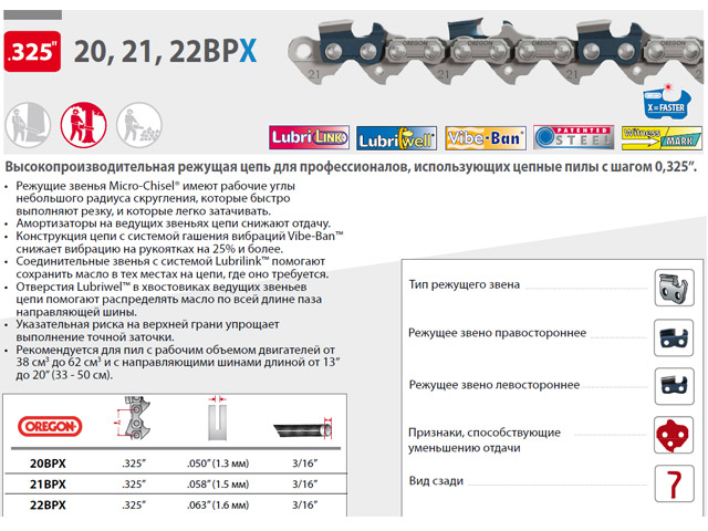 Цепь 40 см 16" 0.325" 1.5 мм 66 зв. 21BPX OREGON (затачиваются напильником 4.8 мм, для нерегулярн. интенсивного использования)