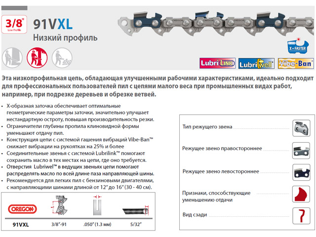 Низкопрофильная пильная цепь Oregon 91VXL 3/8" 1,3мм