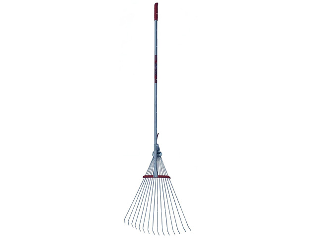 Конструкция рабочей части - раскладная, фиксатор - цанговый, пластиковый. Тип граблей - веерные проволочные, кол-во зубьев - 15. Ширина в разложенном виде - 550мм.