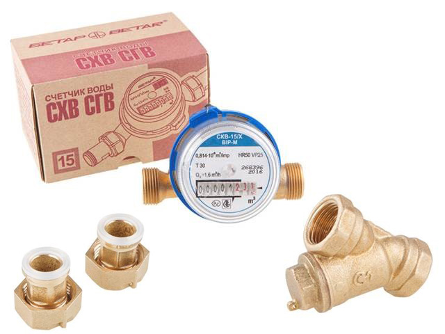 Счетчик для холодной воды СКВ-15/Х (комплект) РБ "ВIР-М" (В комплекте: Фильтр грубой очистки, Узел присоединительный) (Эрготех)