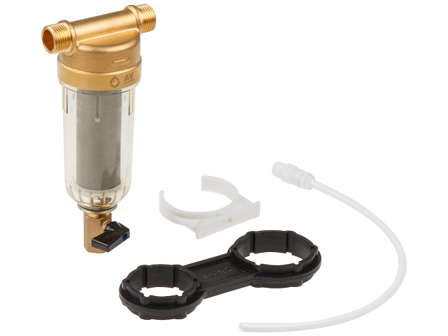 Латунный промывной механический фильтр с внутренней резьбой 1/2", с сеточным картриджем из нержавеющей стали на 100 микрон и латунной колбой. Используется для горячей воды
