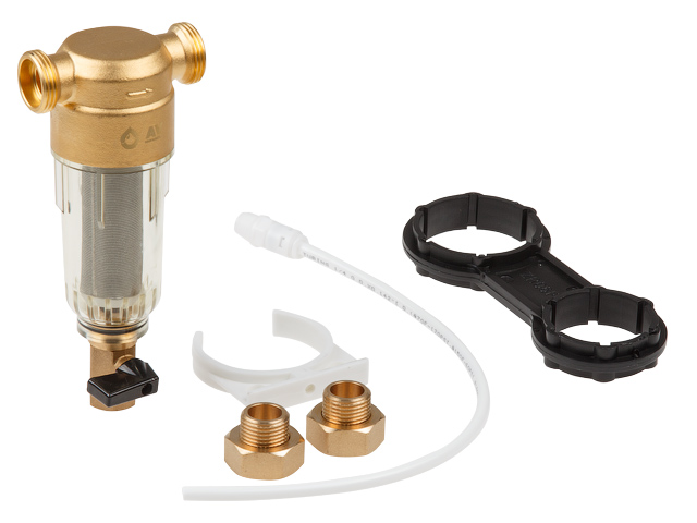 Латунный промывной механический фильтр с наружной резьбой 1/2", с сеточным картриджем из нержавеющей стали, 100 микрон, и со спускным краном.