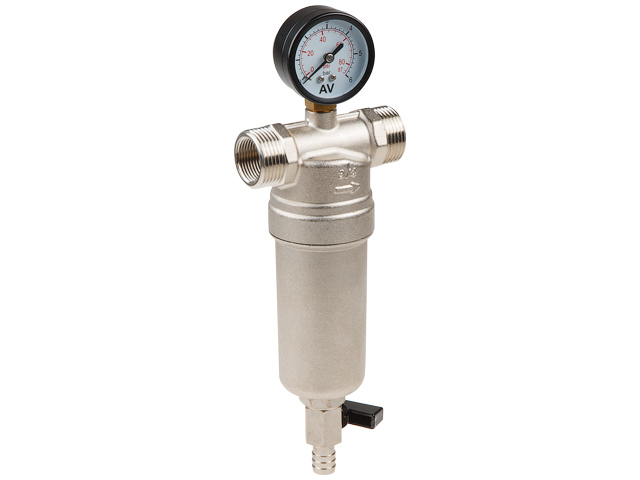 Латунный промывной механический фильтр с внутренней резьбой 3/4" и наружной на 1", с сеточным картриджем из нержавеющей стали, 100 микрон, с датчиком давления и со спускным краном.