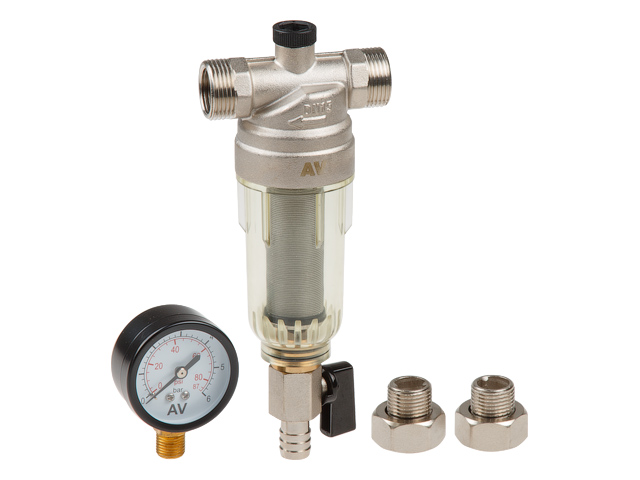Латунный промывной механический фильтр с внутренней резьбой 1/2" и наружной на 3/4", с сеточным картриджем из нержавеющей стали, 100 микрон, с датчиком давления и со спускным краном.