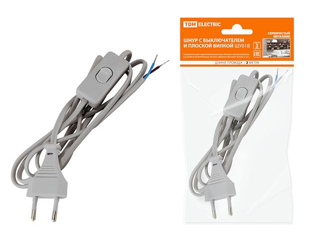 Шнур с выключателем и плоской вилкой ШУ01В ШВВП 2х0,75мм2 2м. серебр. металлик TDM купить в Минске: