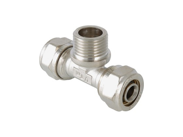 Фитинг обжимной - тройник с переходом на наружную резьбу для присоединения металлополимерных (металлопластиковых) трубопроводов. Резьба фитинга - наружная трубная по ГОСТу 6357.