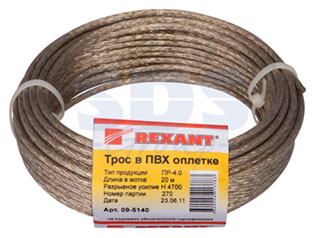 Трос стальной в ПВХ оплетке d=4,0 мм, прозрачный ( моток 20 м) REXANT