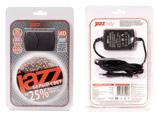 Лента светодиодная PLS-BL 2,5 (4.8 Вт/м, 300 Лм/м, 3500К, IP65, 12В (2.5 м в блистере) JAZZWAY (60 диод/м, холодный белый свет, 8 мм)