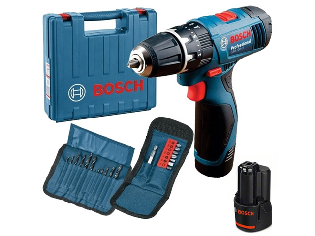 Аккум. ударная дрель-шуруповерт BOSCH GSB 120-LI в чем. + 2 набора сверл и бит (12.0 В, 2 акк., 1.5 А/ч Li-Ion, 2 скор., 28 Нм, шурупы до 7 мм, сверле
