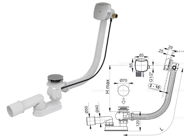 Сифон для ванны с напуском воды через перелив, металл - пластик, Alcaplast