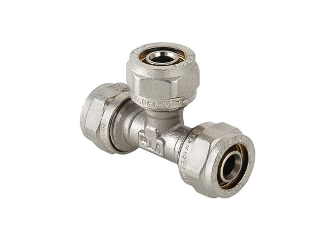 Фитинг обжимной - тройник латунный никелированный для соединения металлопластиковых (металлополимерных) труб. Имеются равнопроходные и переходные модели.