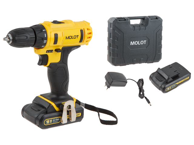 Аккум. дрель-шуруповерт MOLOT MBD 1815 DLi в чем. (18.0 В, 2 акк., 1.5 А/ч Li-Ion, 2 скор., 30 Нм, шурупы до 10 мм)