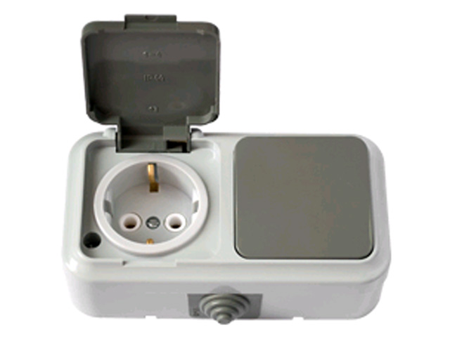 Блок выкл. 1 клав. + розетка (открытая, с/з, брызг. защ.) серая, Пралеска Аква, Bylectrica (IP54 пылебрызгозащищенные)
