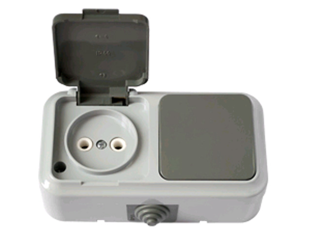 Блок выкл. 1 клав. + розетка (открытая, б/з, брызг. защ.) серая, Пралеска Аква, Bylectrica (IP54 пылебрызгозащищенные)