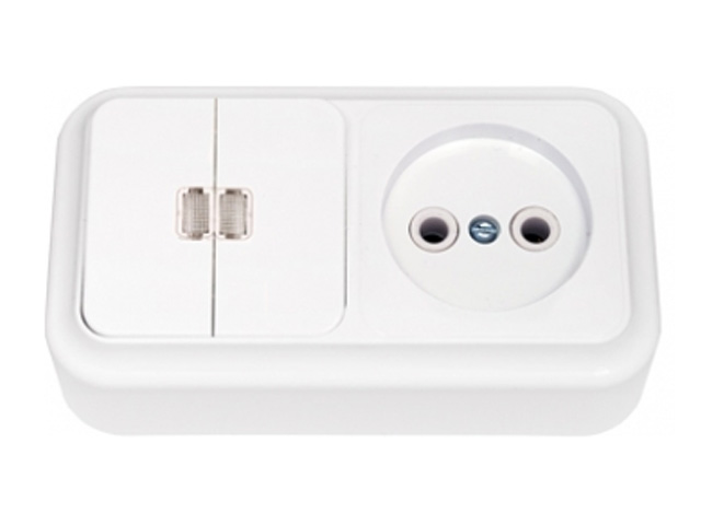 Блок выкл. 2 клав. + розетка (открытая, б/з) со световой индикацией,белая, Пралеска, BYLECTRICA