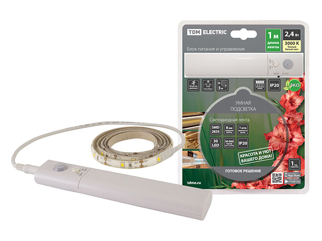 Подсветка умная SMD2835-30LED/m-IP20-5В-2,4Вт-3000 К(1 м), датчик движ., 4хААА TDM (Если батарейки TDM - AAA Alkaline 1,5V, то время работы - 2,5 час